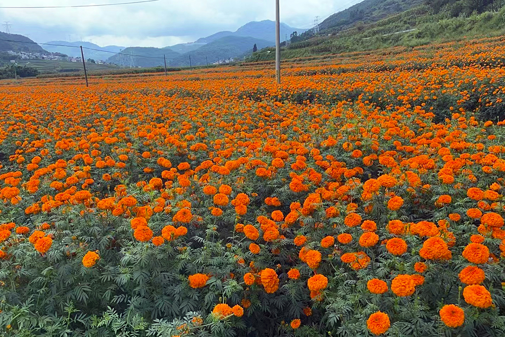 云南省昆明市禄劝彝族苗族自治县中屏镇中屏村委会,万寿菊连片盛开,迎来丰收。2022年全县推广种植4万亩万寿菊,全县全年产量达到6万吨左右,全年增收7千万元。目前全县围绕万寿菊种植事业,做足“花文章”,做到了人人有事干、户户有增收、企业有收益...